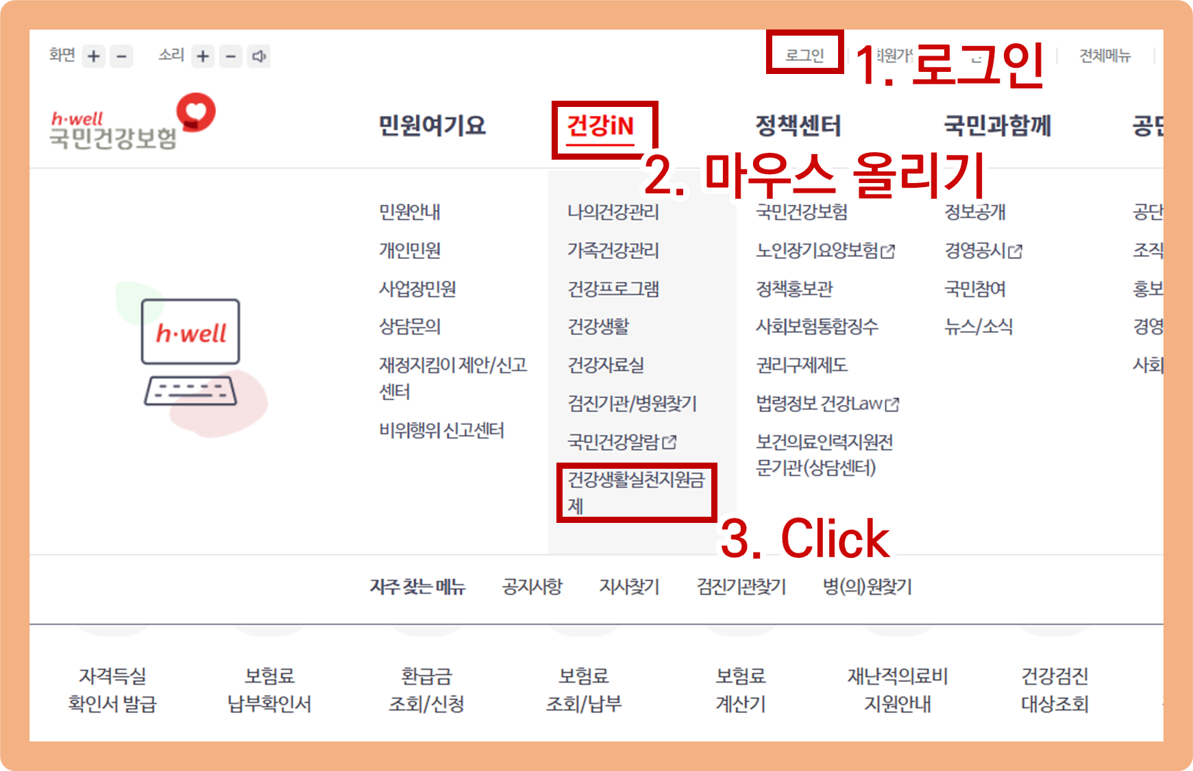 '국민건강보험공단' 공식 홈페이지로 접속 후 로그인을 먼저 진행해주세요.