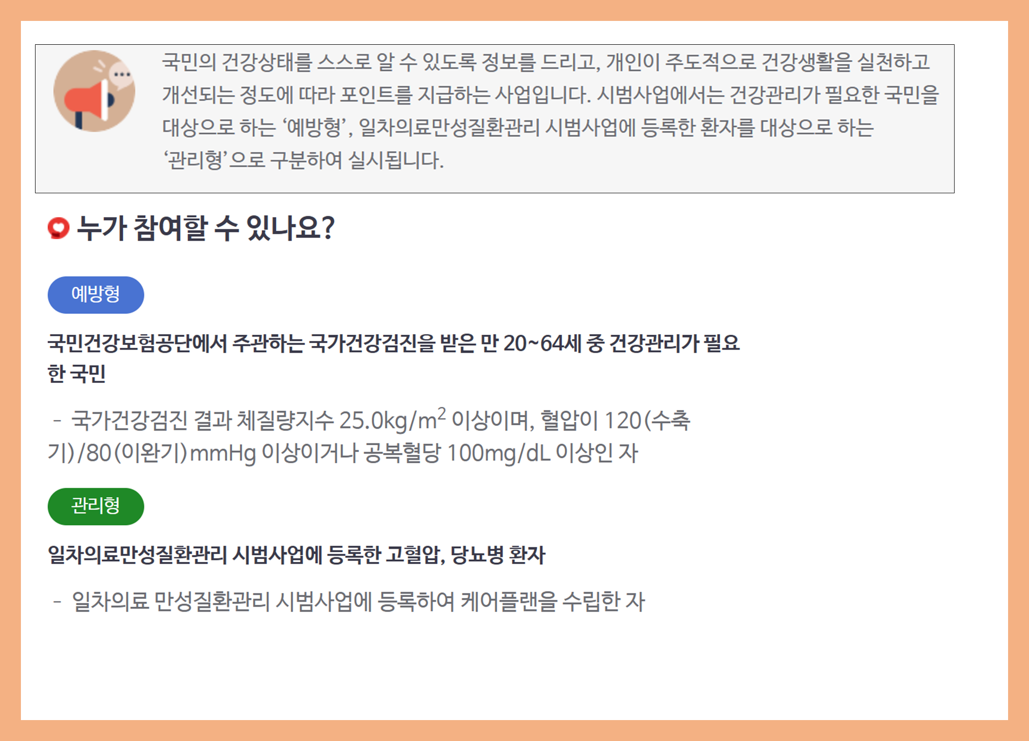 1. 예방형 대상 : 국가 건강검진을 받은 만 20세 ~ 64세로써 조건을 충족하는 자