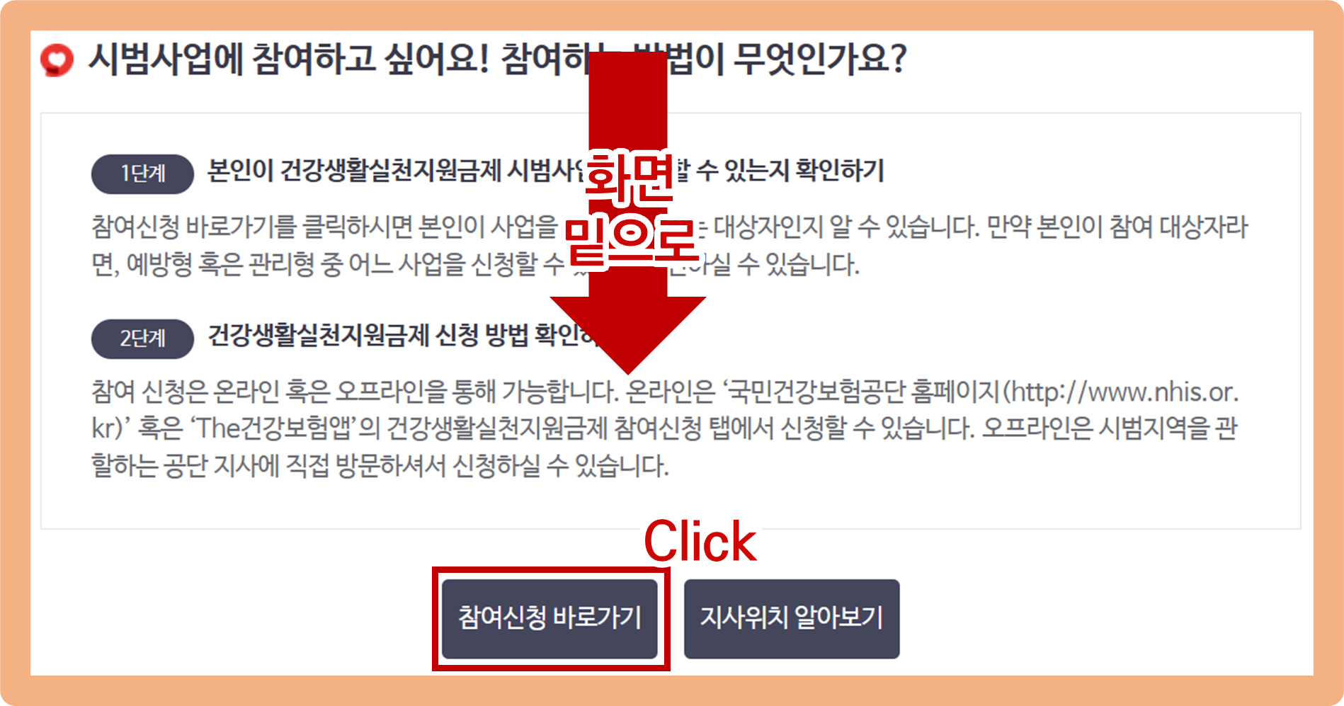 다음 단계에서 화면을 밑으로 내려주시면 나오는 '참여신청 바로가기' 버튼을 클릭해주세요.
