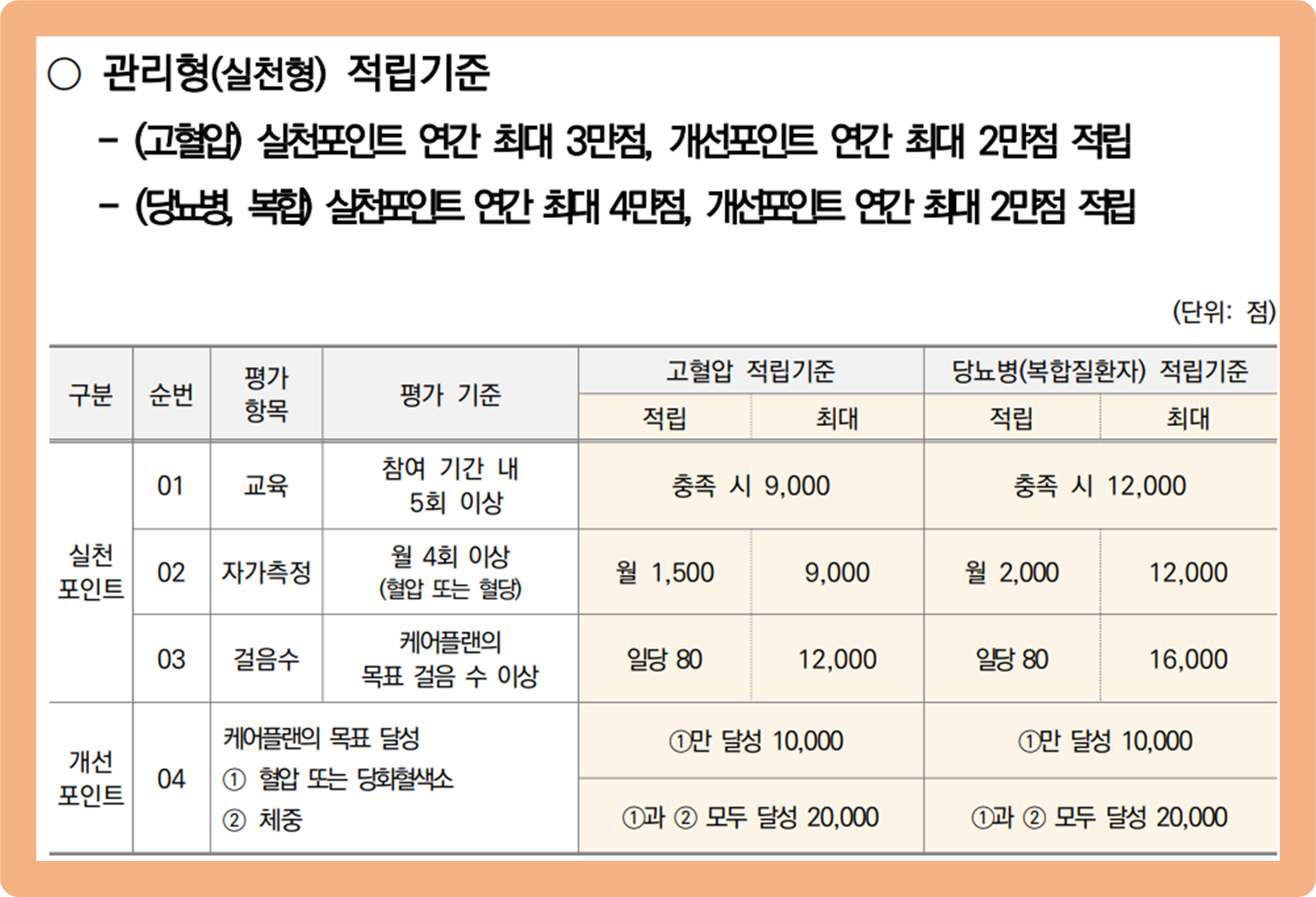 조건 충족한 고혈압 환자는 1년 간 최대 5만 포인트, 당뇨병 환자는 1년 간 최대 6만 포인트를 지급받게 돼요.