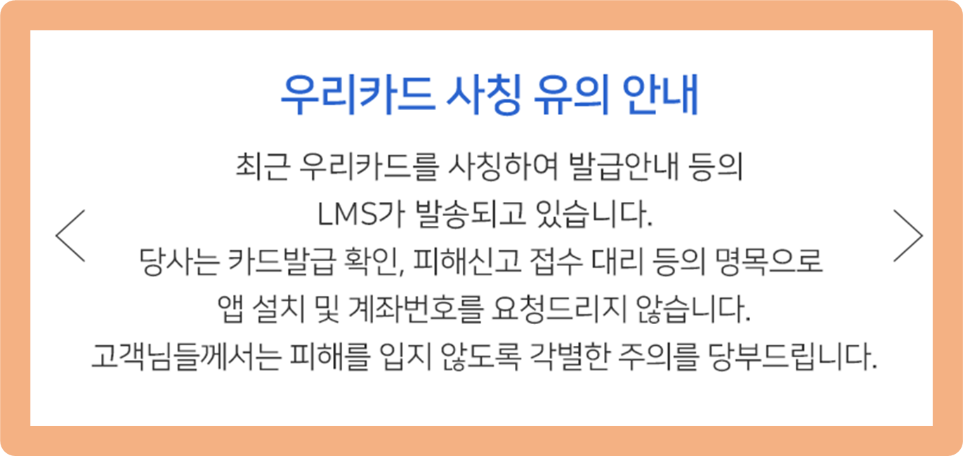 그리고 최근 우리카드를 사칭한 금융 사기 시도가 많이 발생하고 있으니 주의해주세요.