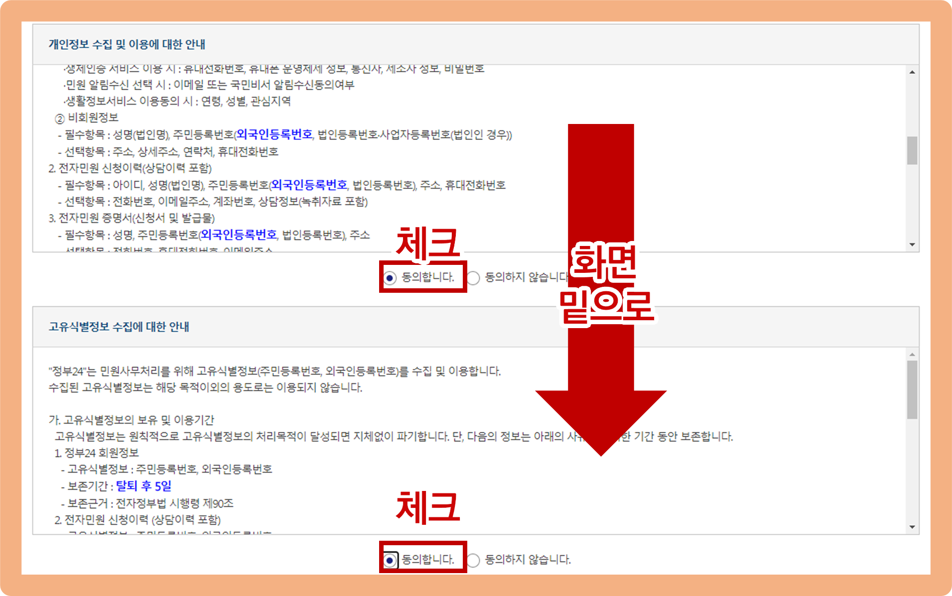 각종 약관 동의에 대해 체크해주신 후, 화면을 아래로 내려주세요.