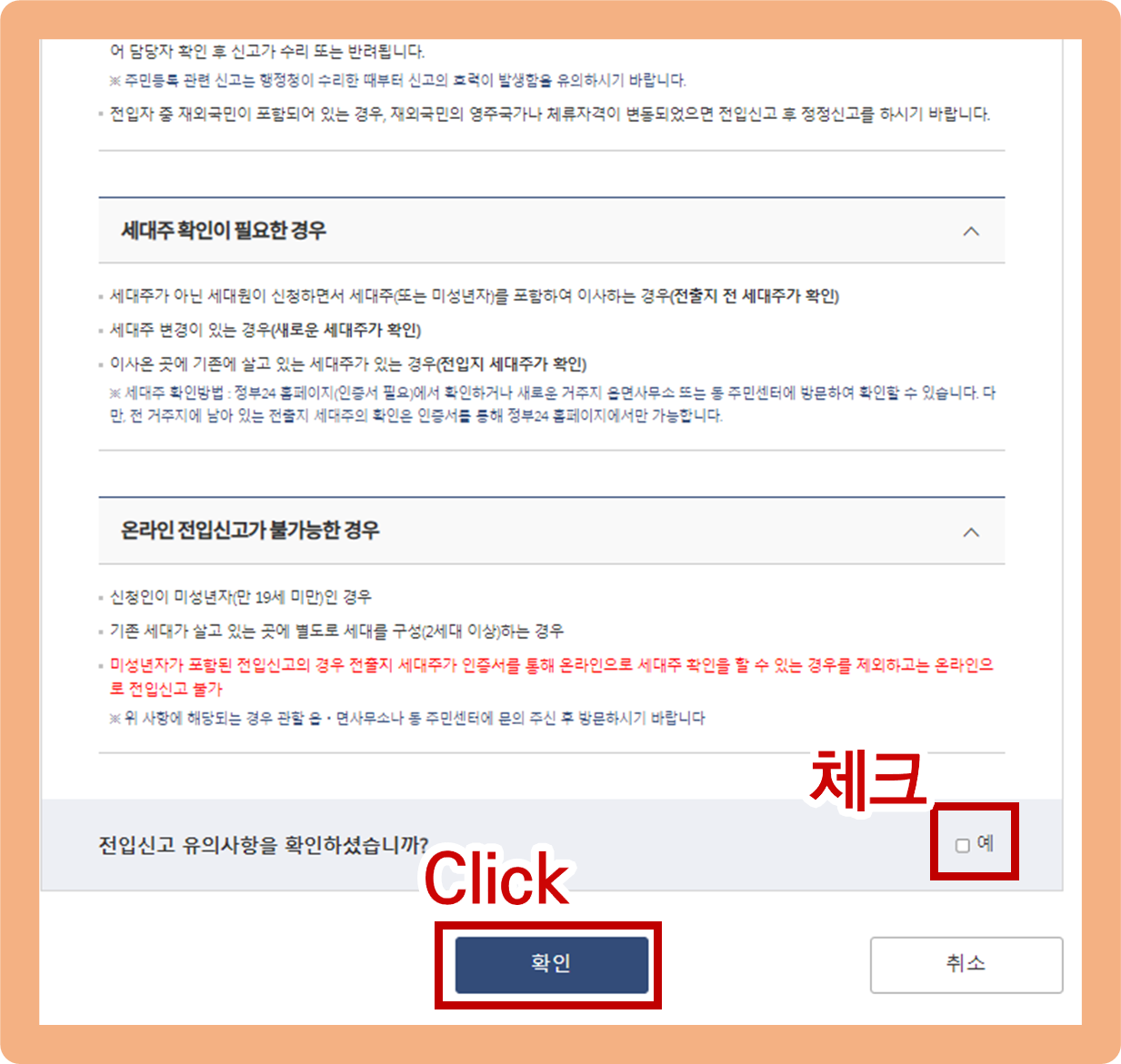 유의사항 확인했냐는 문구 오른쪽에 있는 '예' 버튼에 체크 후, 밑에 보이는 '확인'버튼을 클릭해주세요.
