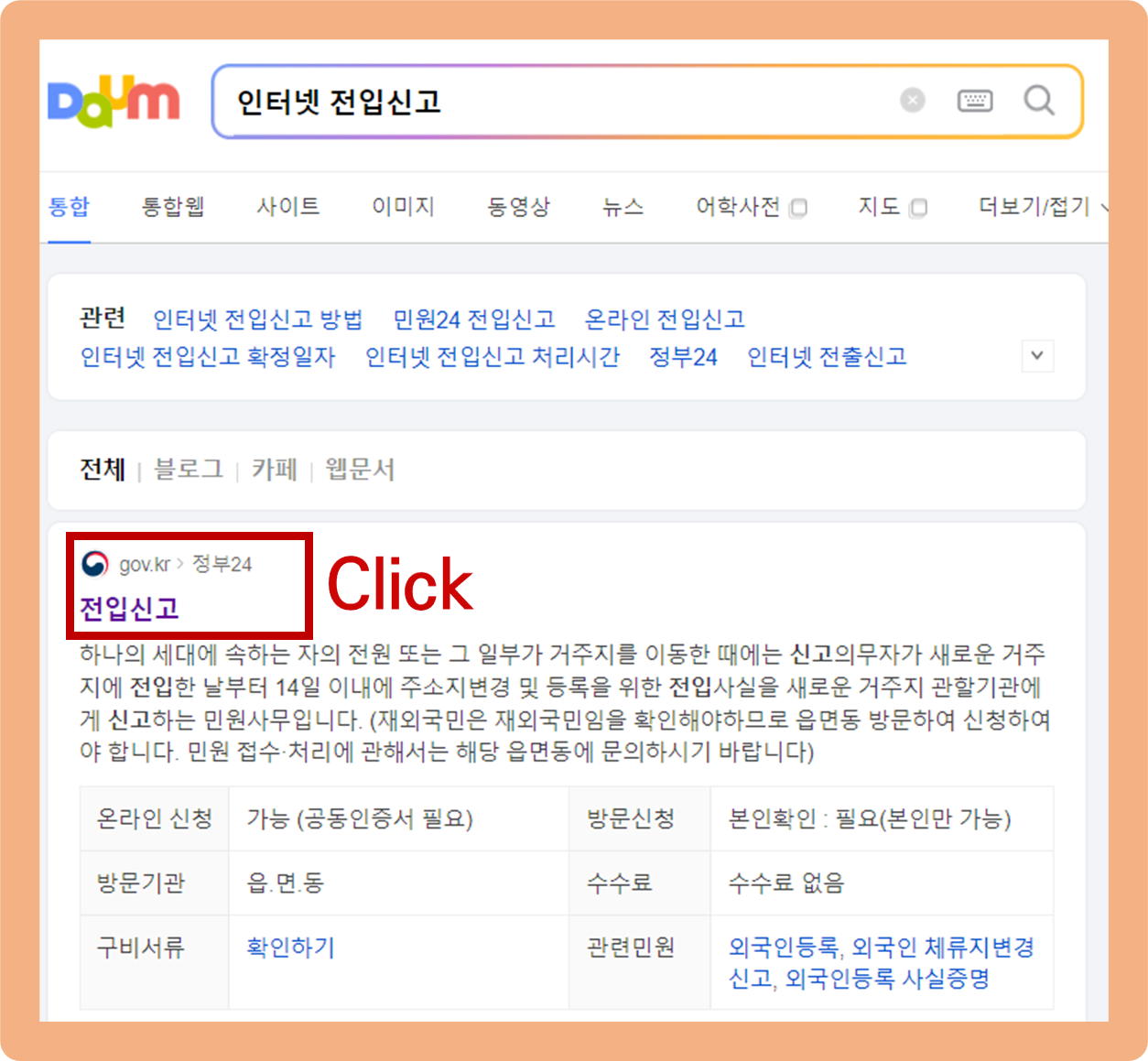 검색창에 '인터넷 전입신고'라고 검색해주시면 위와 같은 화면이 보일거에요/