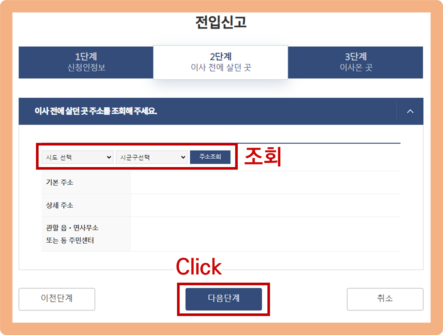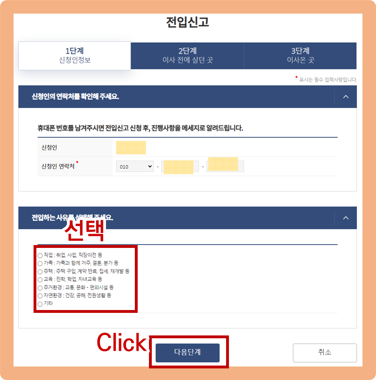 주소지를 이전하는 사유에 대해 선택 후, 밑에 보이는 '다음단계' 버튼을 클릭해주세요.