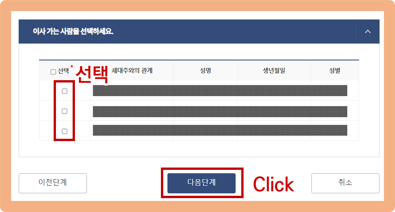 여기서 이사가는 분을 선택 후 '다음단계' 버튼을 클릭해주세요.