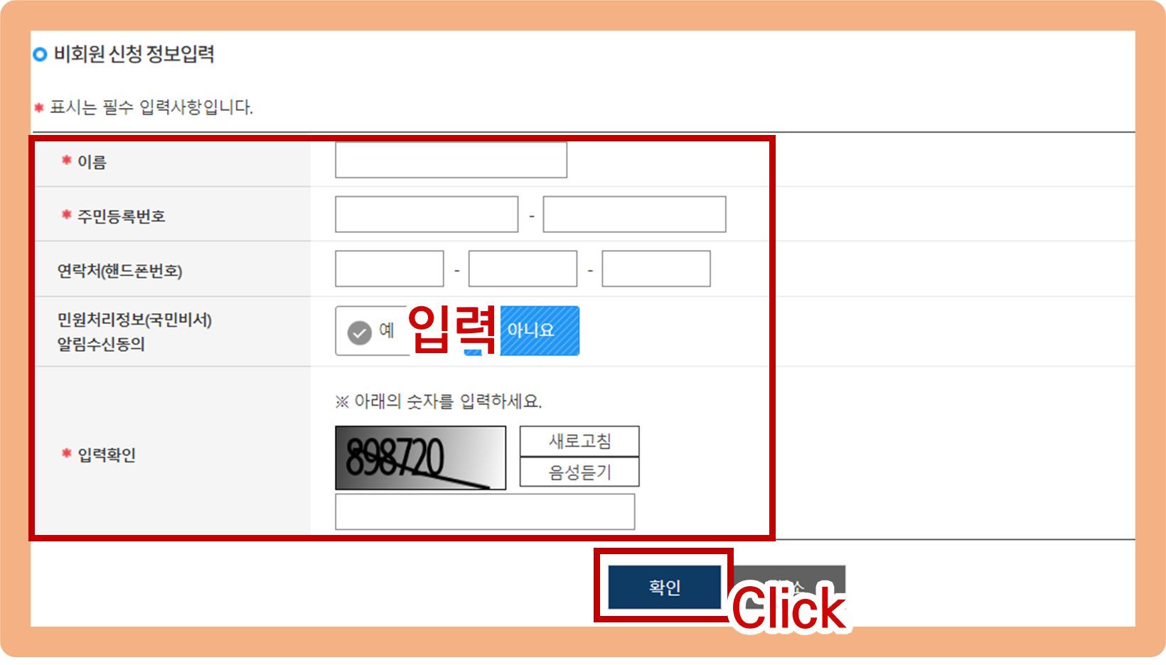 비회원으로 신청했기 때문에 화면을 내리면 신청인 성명, 주민등록번호 등을 입력하는 칸이 나와요.
