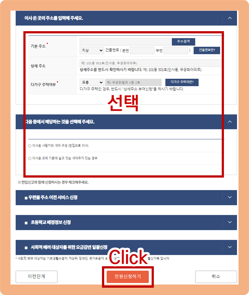 새로 이사하는 주소지를 선택한 후 나머지 선택사항들을 선택한 뒤 '민원신청하기' 버튼을 클릭하면 주소지 이전 신청 완료에요.