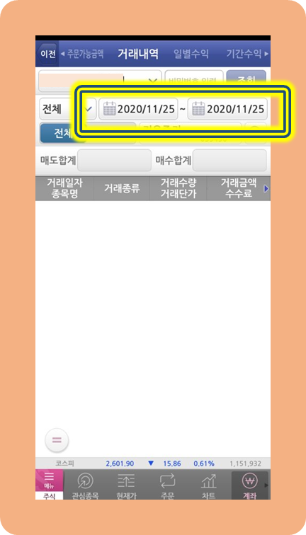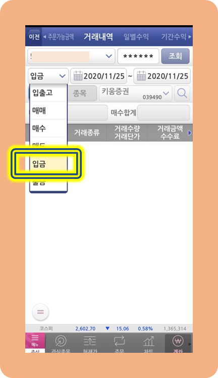 거래내역으로 들어오셨으면 이제 배당금을 조회하기만 하면 돼요.