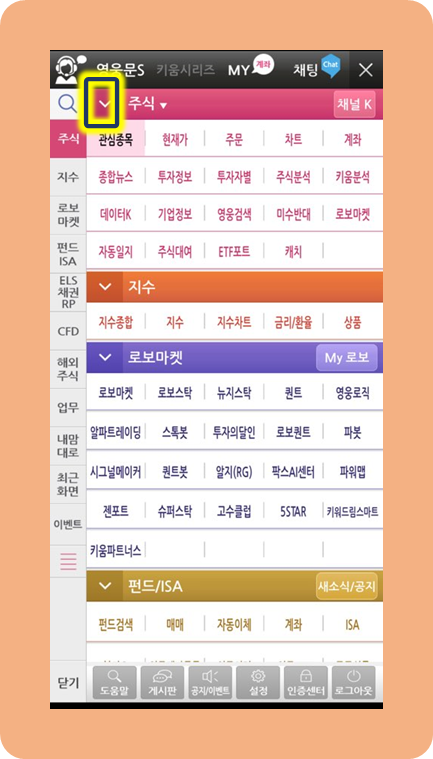 사진에 표시한 것처럼, 맨 위에 있는 주식 버튼 바로 왼쪽에 있는 V 자형 버튼을 누르세요.