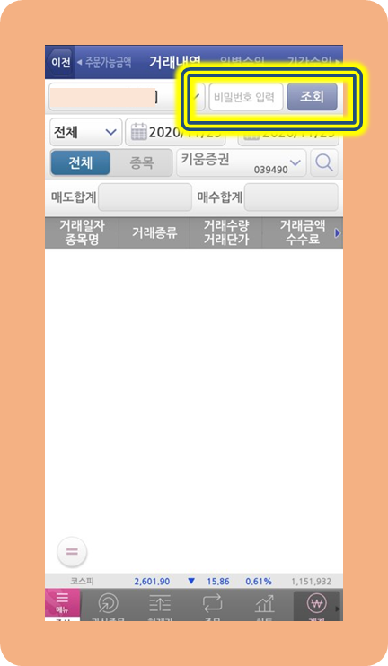 이 메뉴들 속에서, 오른쪽에 거래내역을 찾아서 눌러주세요.