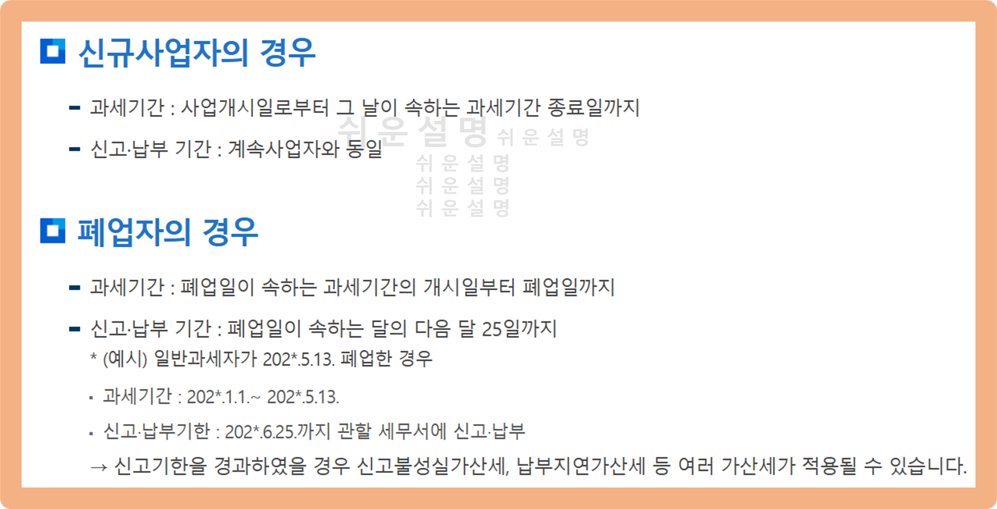 2. 신고 및 납부 기간 : 폐업일이 속한 달의 다음 달 25일까지