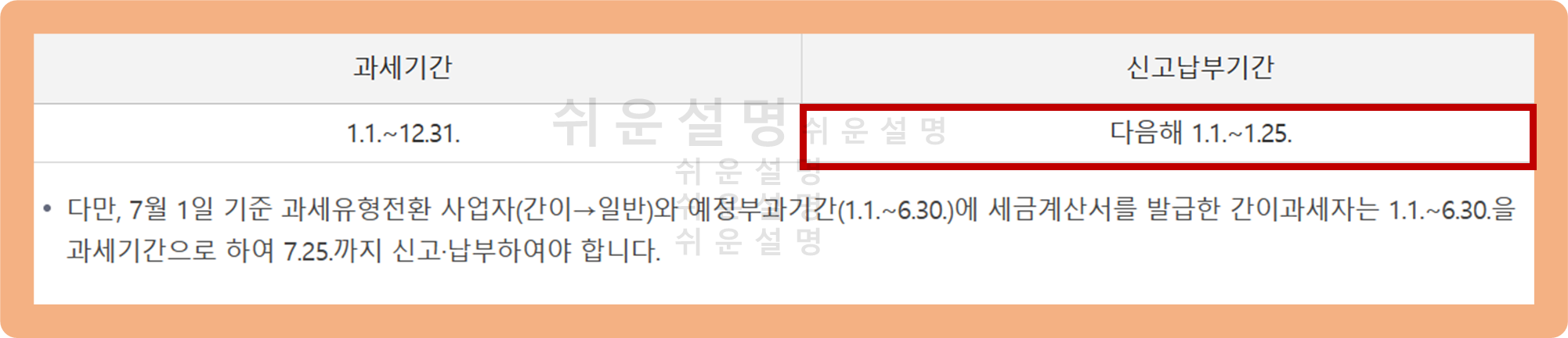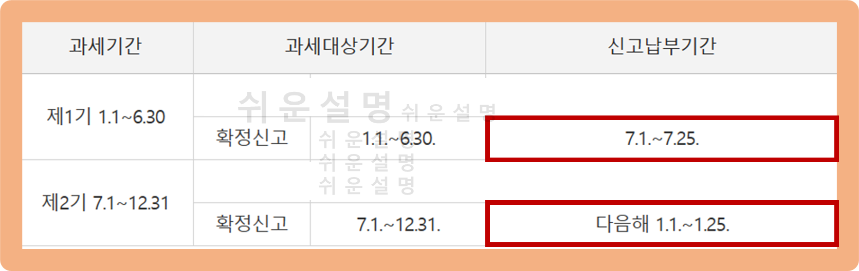 그리고 신고 납부 기간은 '7월 1~25일, 다음년도 1월 1~25일'로 1년에 두 번 진행돼요.