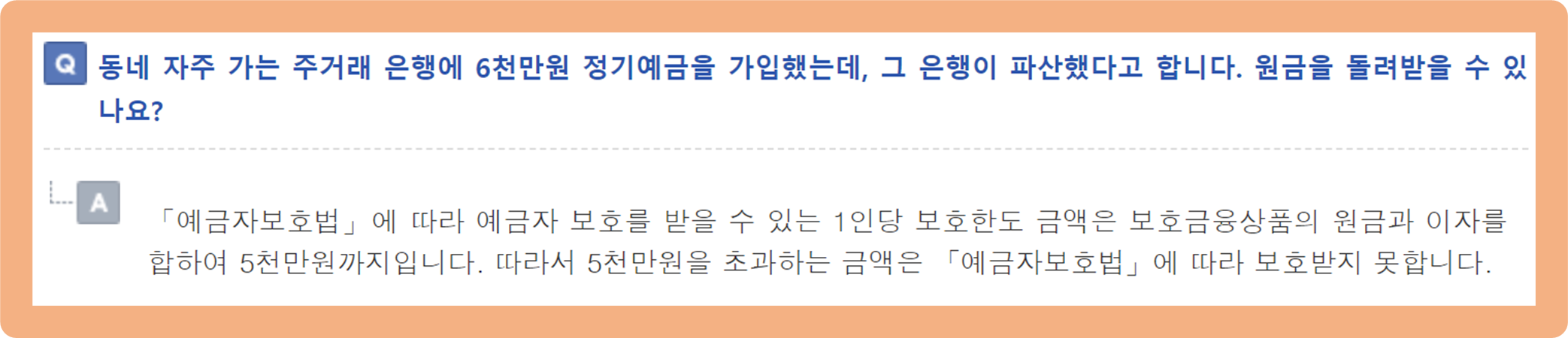 만약 주거래 은행에 6,000만원 상당의 예금을 맡겼을 경우, 해당 은행이 파산할 경우 원금과 이자를 포함하여 5,000만원까지만 법적 보호를 받을 수 있다는 것이죠.