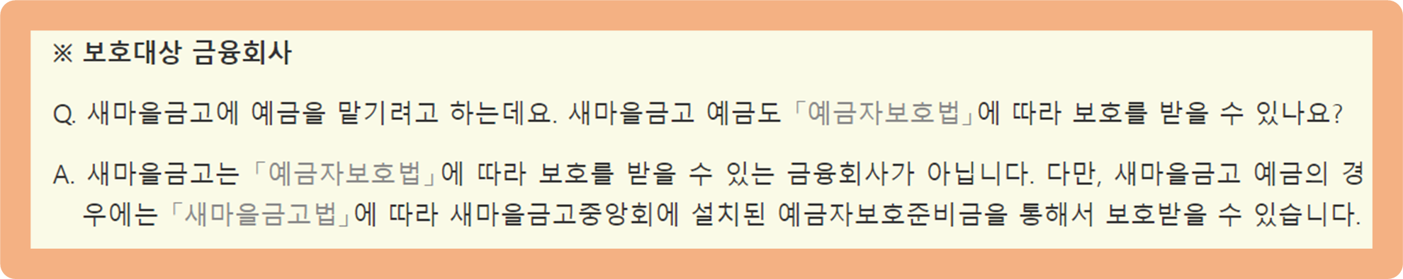 새마을금고는 예금자보호법이 아닌, 새마을금고법에 따라 새마을금고중앙회에 설치된 예금자보호준비금을 통해 5,000만원 한도의 보호를 받구요.