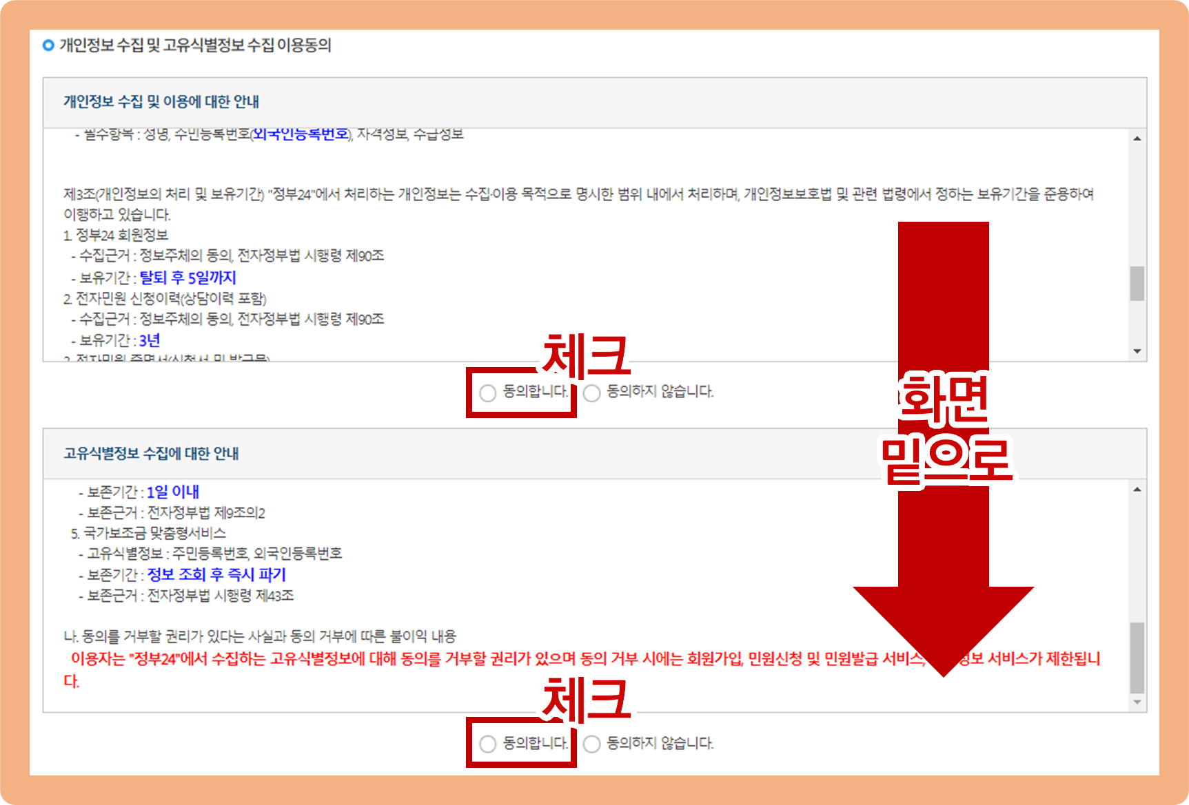 개인정보 수집 및 고유식별정보 수집에 대해 동의한다고 체크해주시구요. 화면을 아래로 내려주세요.