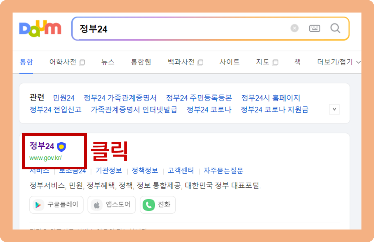 검색창에 '정부24'를 검색해주신 후 상단에 나오는 공식 홈페이지로 접속해주세요.