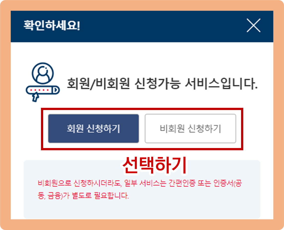 본인인증을 해야되기 때문에 회원or비회원 중 하나를 선택해야 돼요.