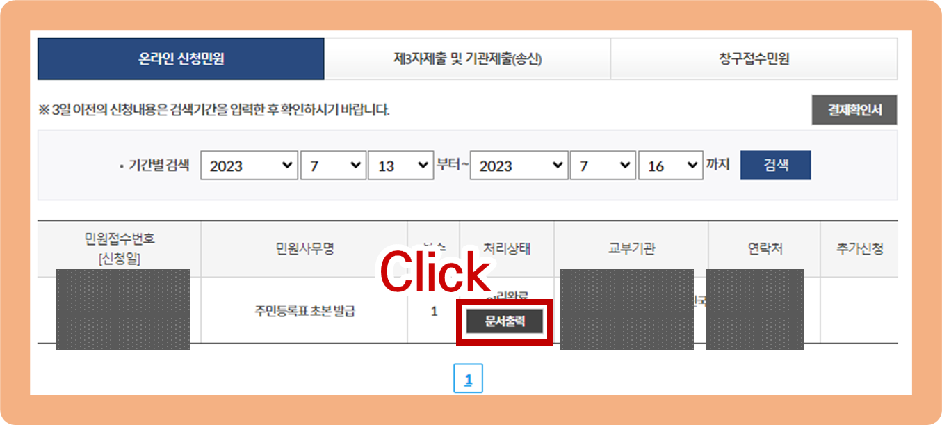 주민등록초본 인터넷발급 방법. 민원신청하기 버튼