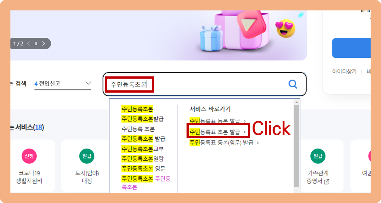 홈페이지에 접속 하셨으면 검색창에 '주민등록초본'을 입력만 해주세요.(엔터x)