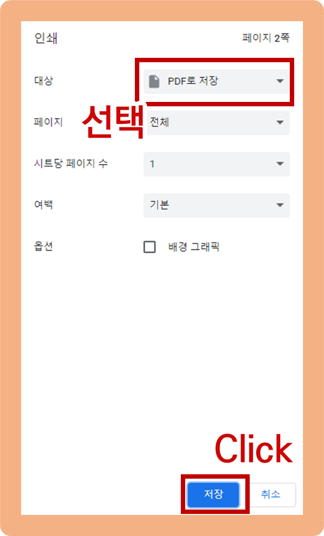 대상을 'PDF로 저장'으로 선택 후 '저장' 버튼을 클릭하면 PDF 파일 저장까지 완료돼요.