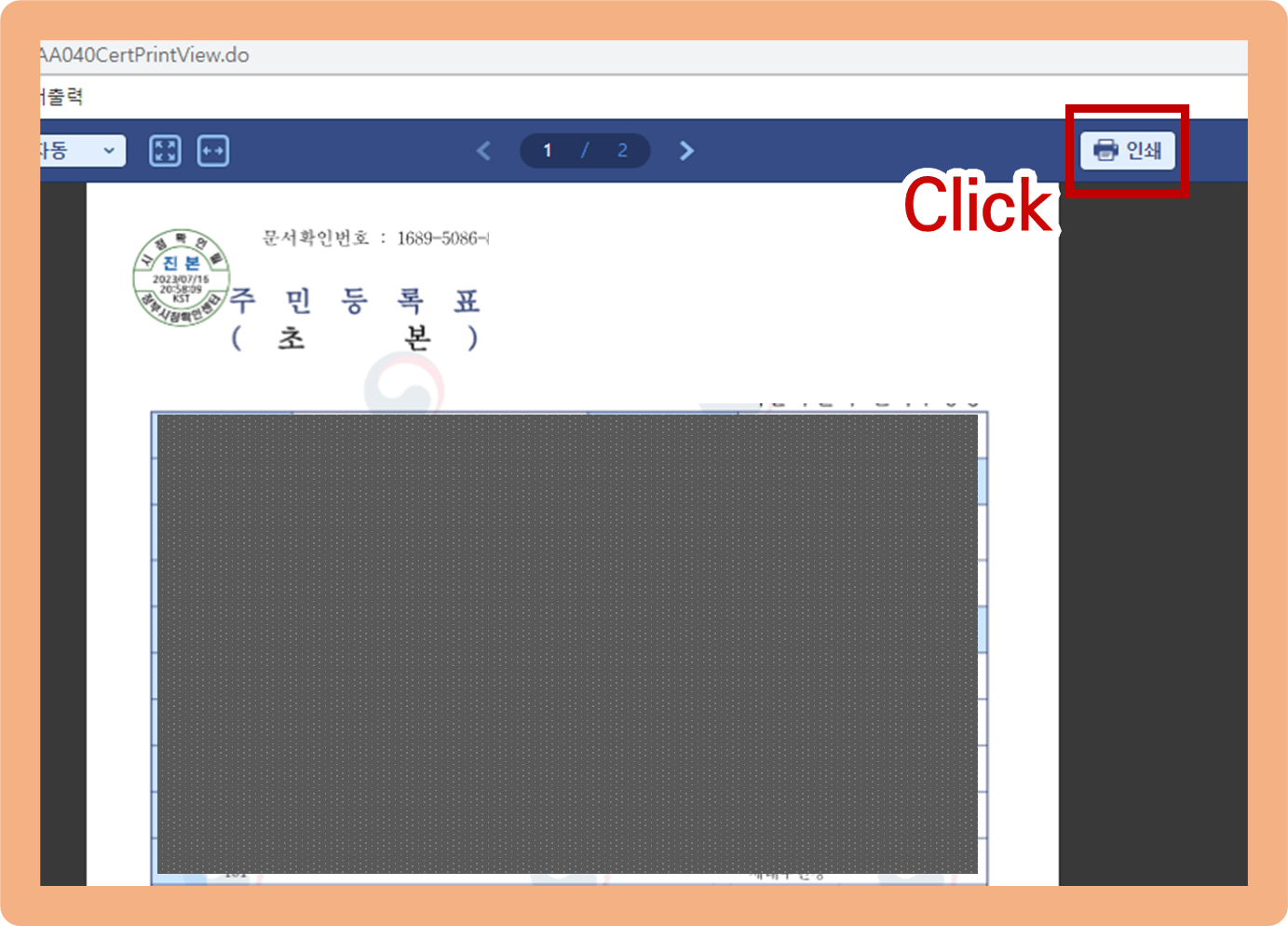 주민등록초본 인터넷발급 방법. 문서출력 버튼