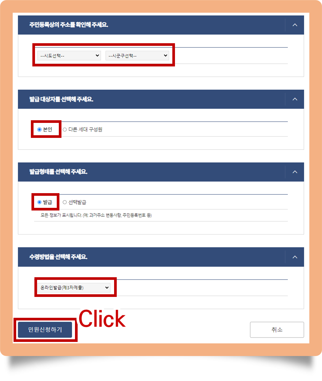 주소를 선택해주시구요. 발급 대상자, 발급형태, 수령방법을 확인해주신 후 '민원신청하기' 버튼을 클릭해주세요.