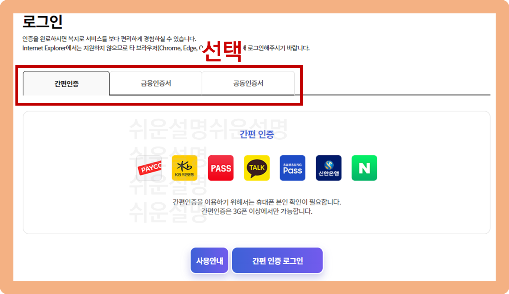 간편인증 or 공동 및 금융인증서 인증 방법 중 원하는 방법을 선택해서 본인 인증을 진행해주세요.