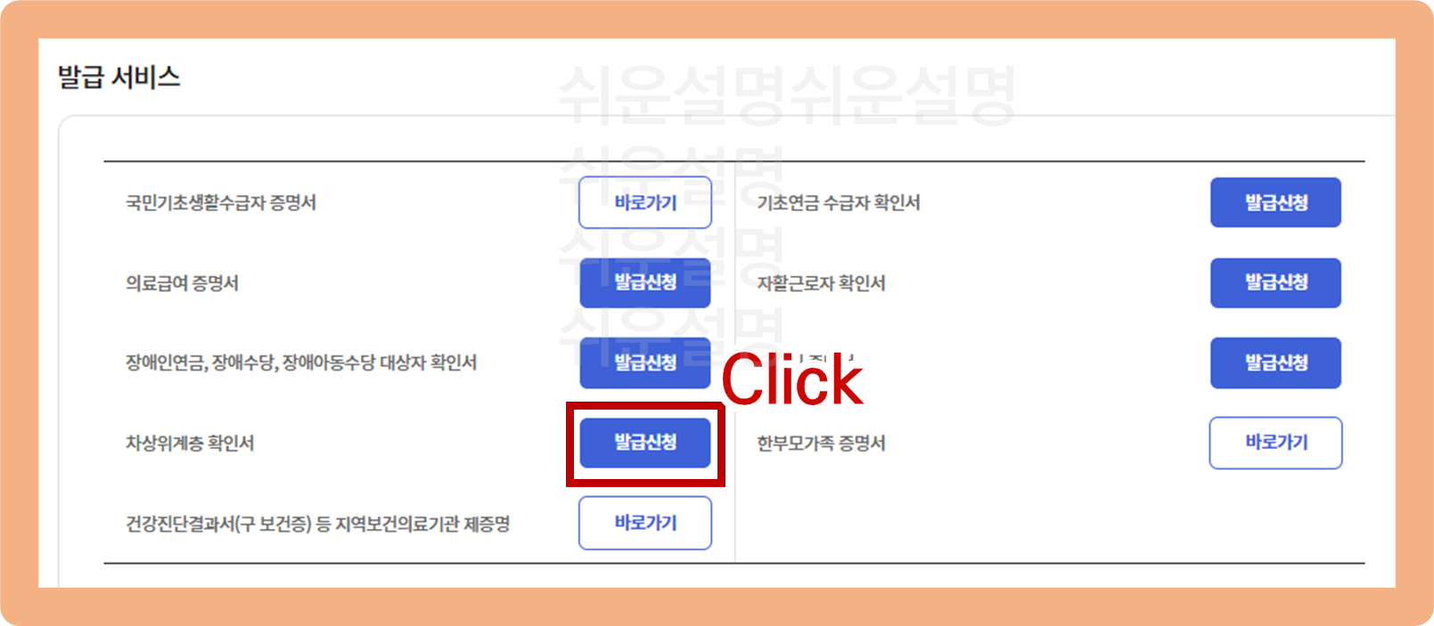 이 중 차상위계층 확인서 옆에 있는 '발급신청' 버튼을 클릭해주세요.