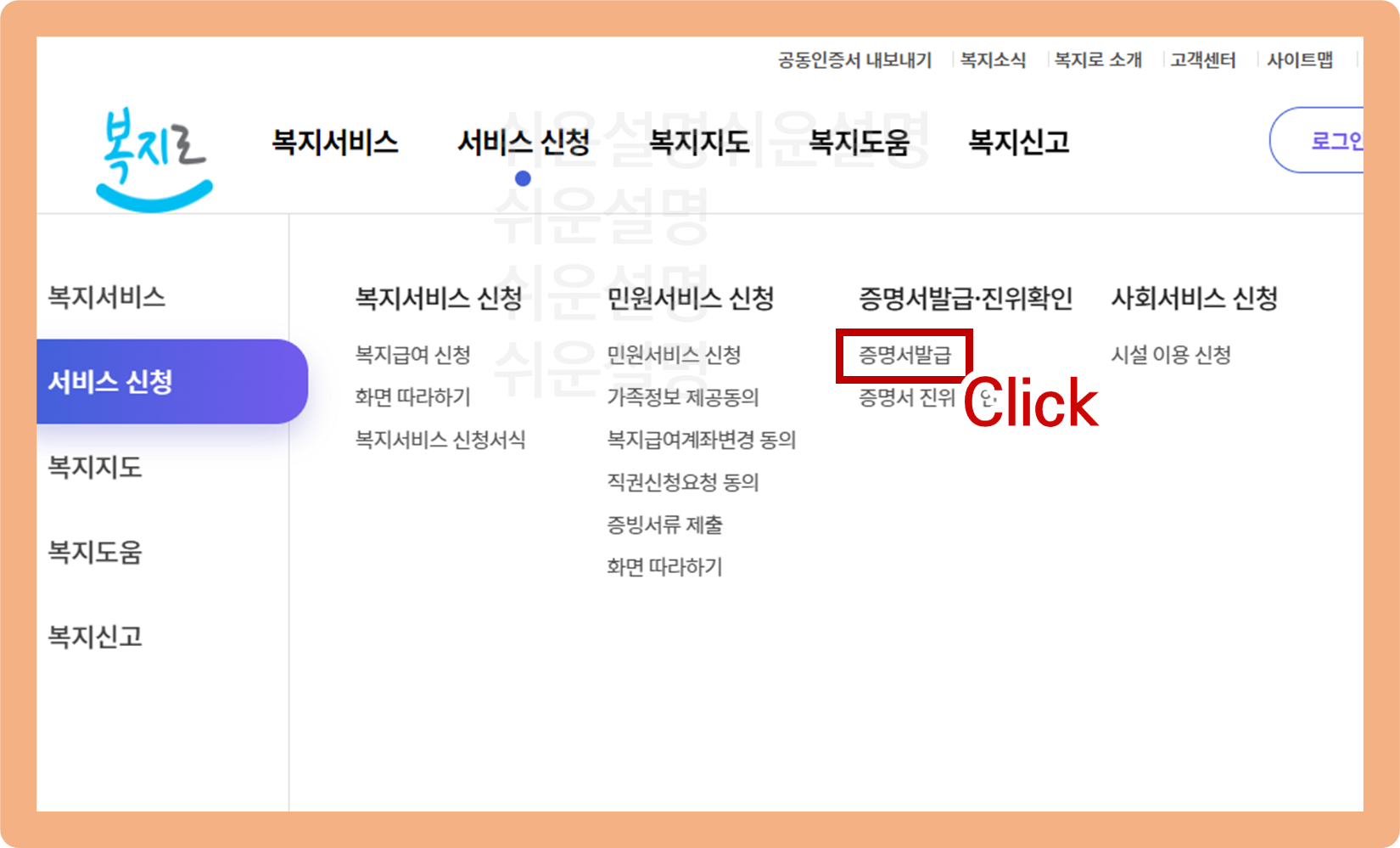 차상위계층 확인서 발급 신청방법. 증명서발급 메뉴