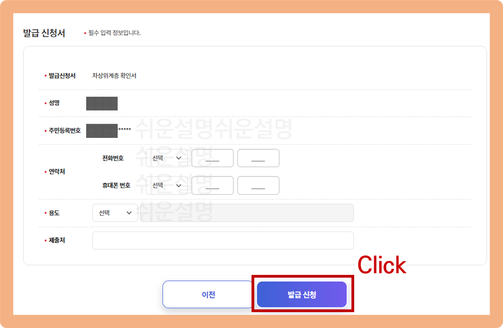 연락처, 용도, 제출처 등을 입력 후 '발급신청' 버튼을 클릭하면 차상위 계층 확인서 발급 신청이 완료돼요.