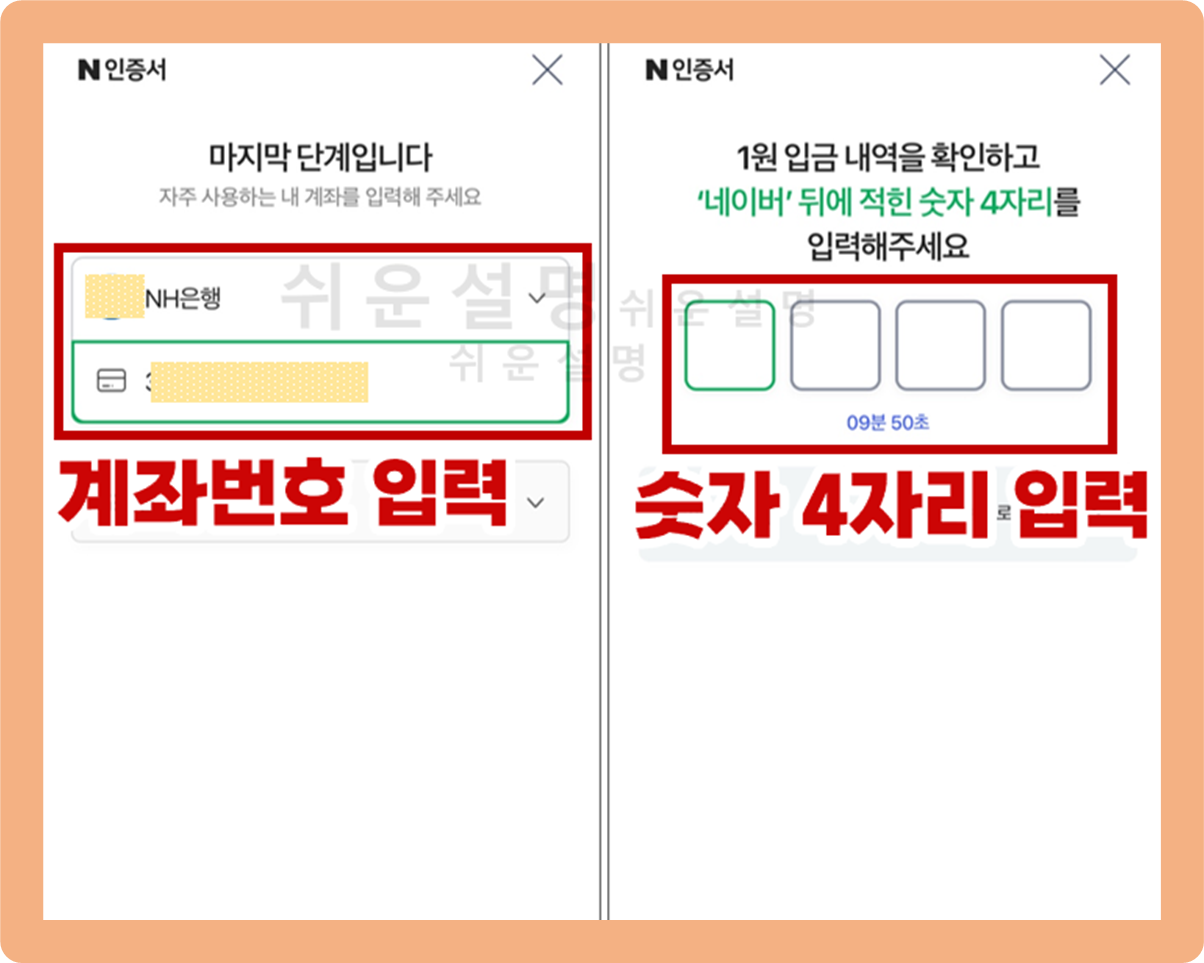 네이버 공동인증서 발급방법. 계좌번호 입력, 입금자명 숫자 4자리 입력