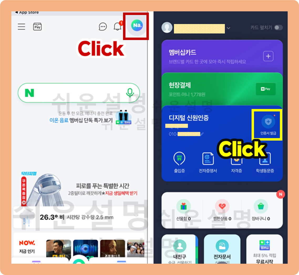 공동인증서 발급을 위해 네이버 어플을 실행해주세요. 어플이 없으신 분들은 앱스토어or구글플레이스토어에서 다운로드 받으시면 돼요.