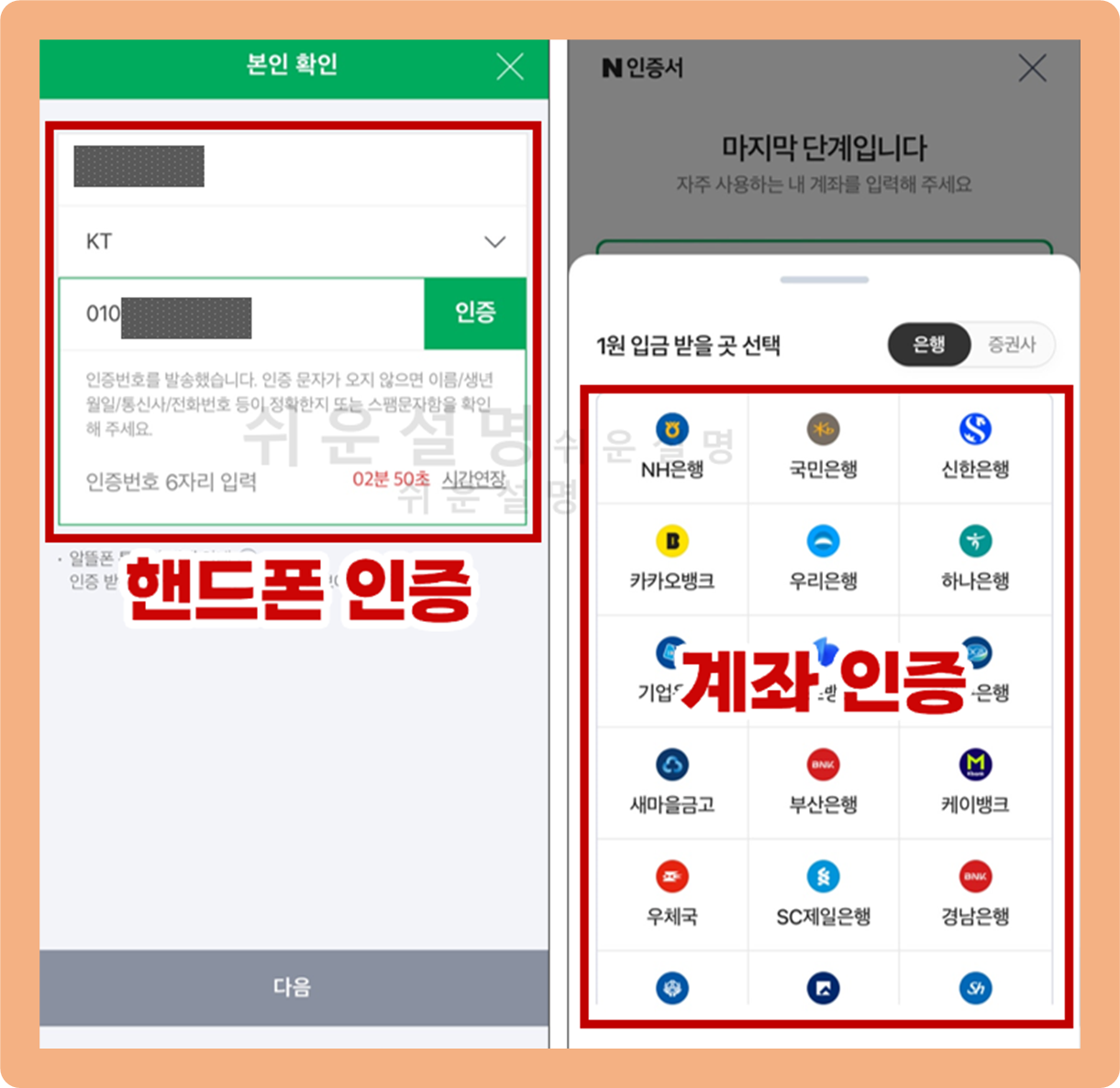 (왼쪽사진) 본인 명의로 된 핸드폰을 통해 본인 인증을 진행해주시구요.