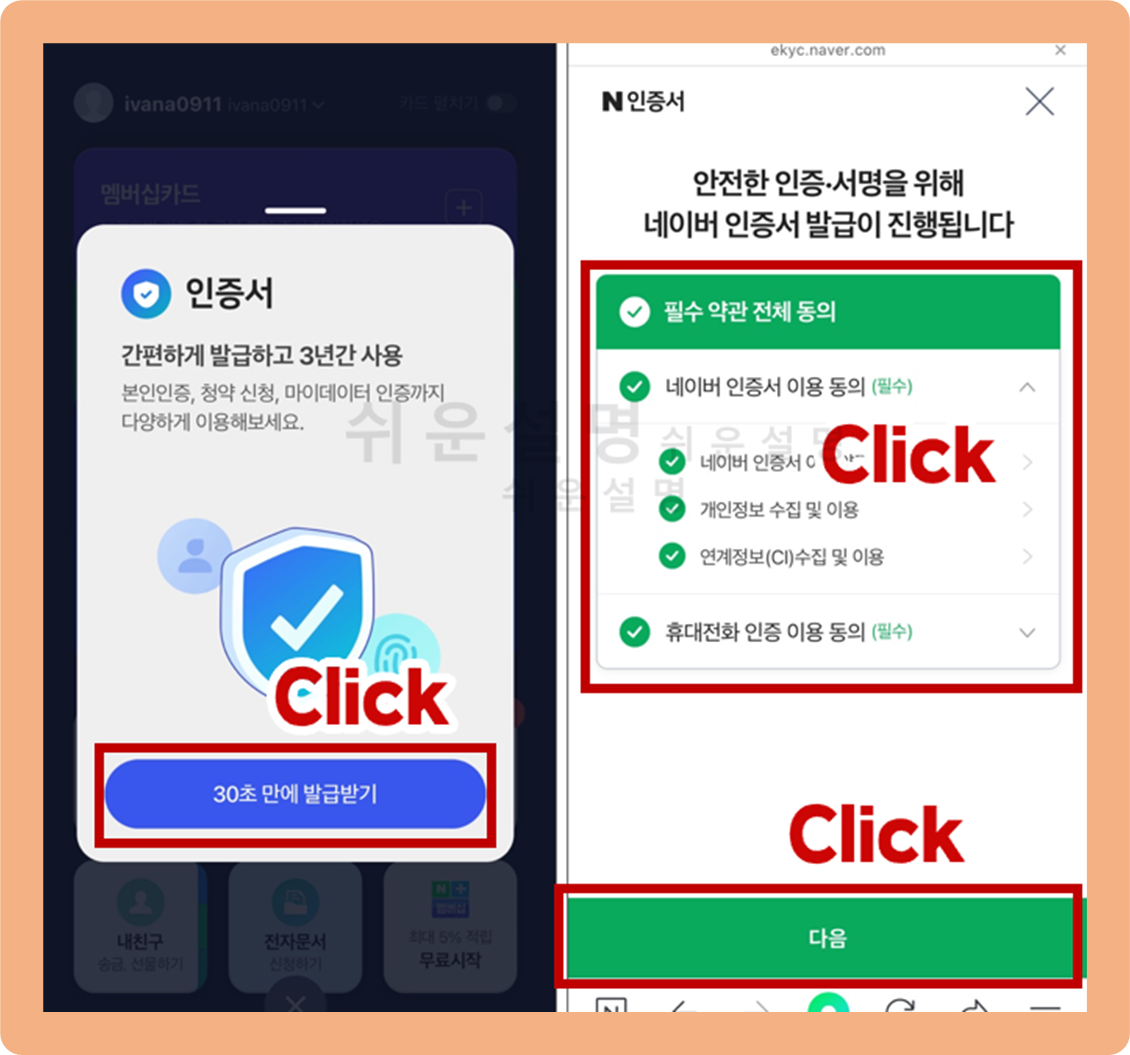 (왼쪽사진) 다음 화면에서 '30초만에 발급받기' 버튼을 클릭해주세요.