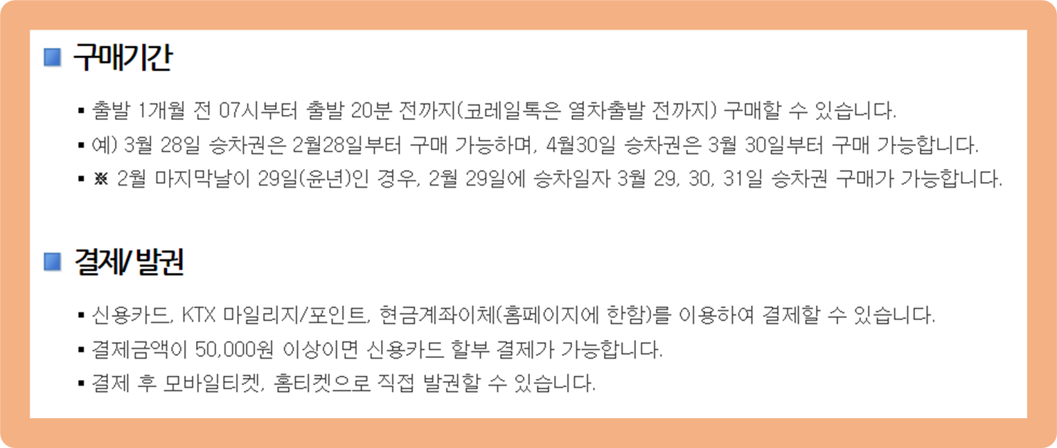 KTX 환불 규정 취소 수수료 정리, 지연 배상 보상금에 대해 알아보기 전에 먼저 구매 가능 기간 및 결제,발권 수단을 살펴볼게요.