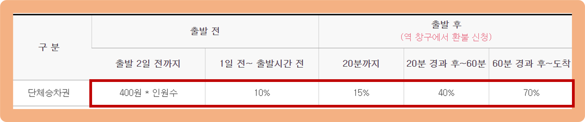 - 출발 2일 전까지 : 예매 인원 수*400원