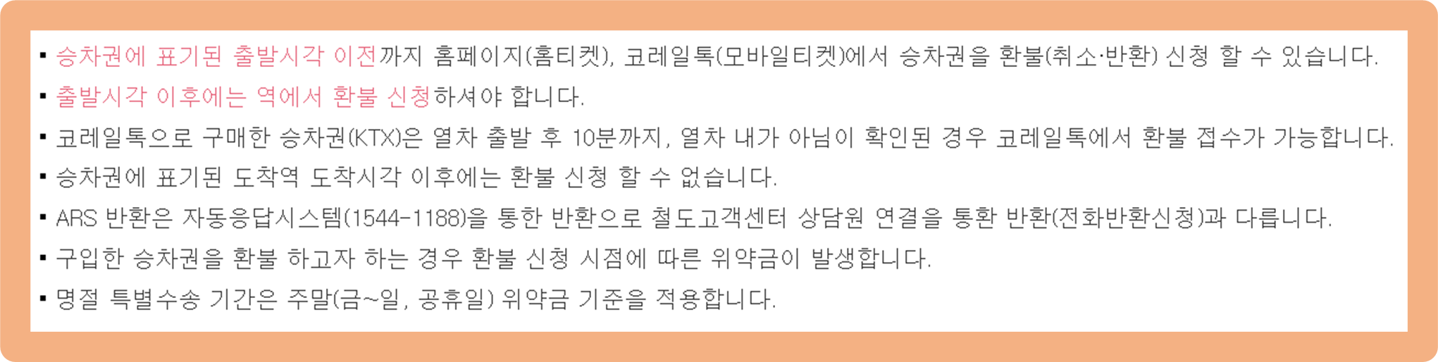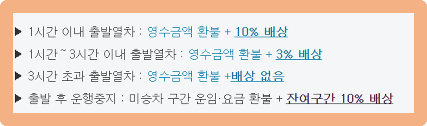 - 3시간 초과 출발 열차 : 승차권 환불 + 추가 배상x