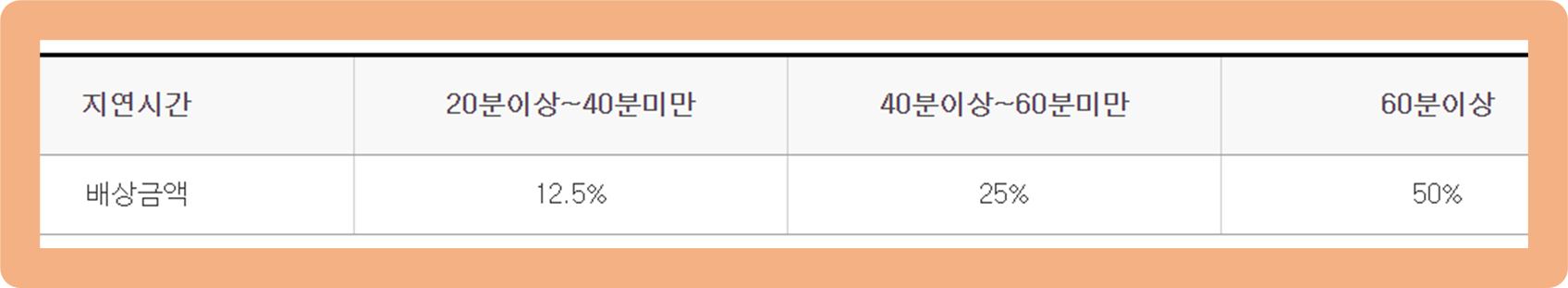 - 40분 이상 ~ 60분 미만 지연 : 승차권 가격의 25% 배상