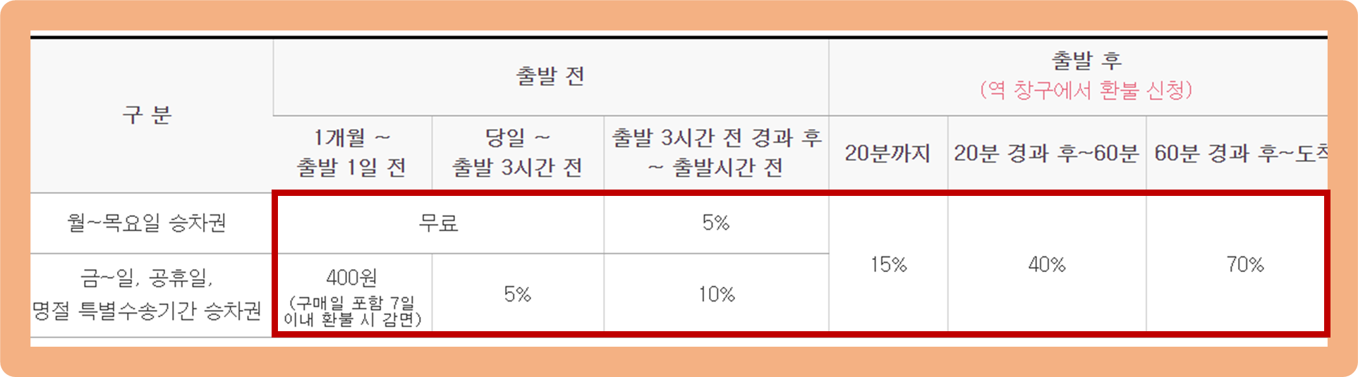 2. 열차가 출발하기 전인 경우(금요일~일요일, 공휴일, 명절 특별 수송 기간인 경우)