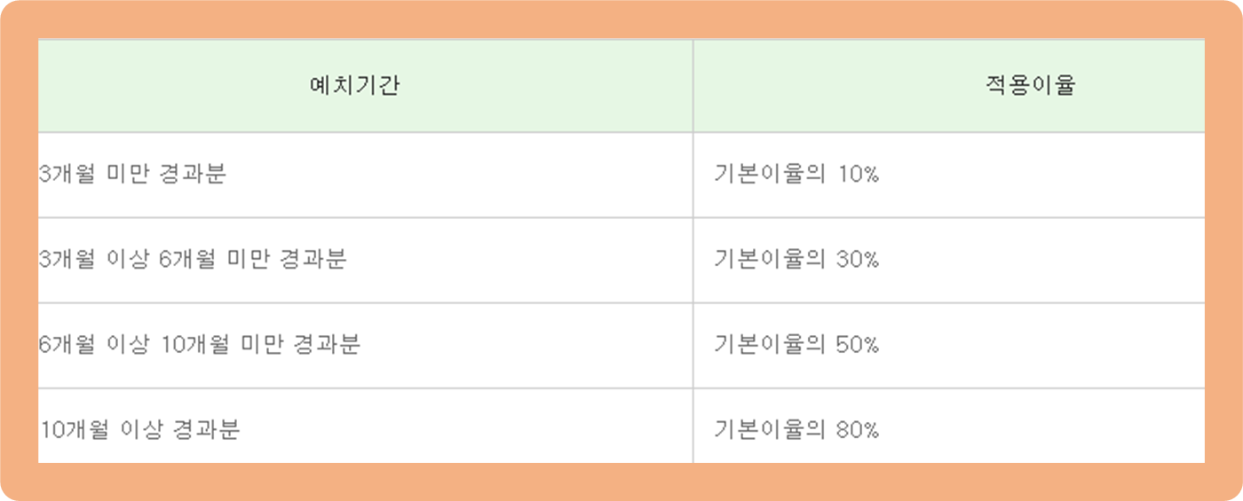 - 예치기간 3개월 미만 경과분 : 기본 이율의 10%