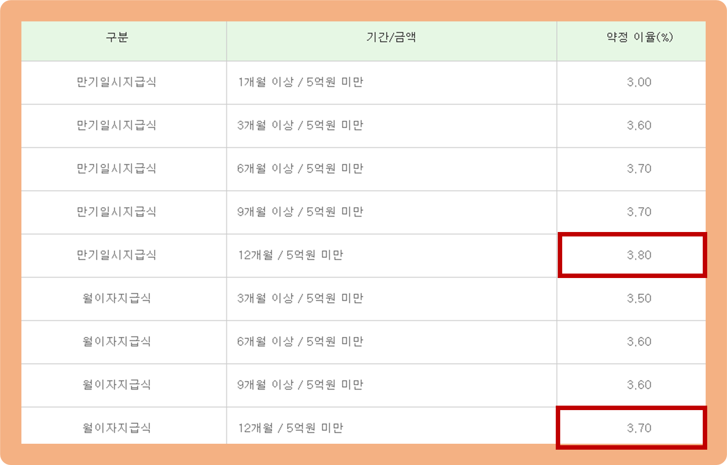 - 최저 3.5%(3개월) ~ 최대 3.7%(12개월)