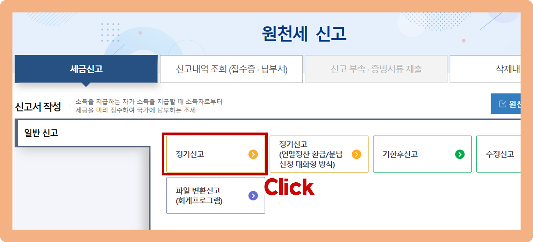 그 다음 단계에서 '정기신고'버튼을 클릭하신 후 안내 절차에 따라 신고서를 작성해주시면 끝이에요.