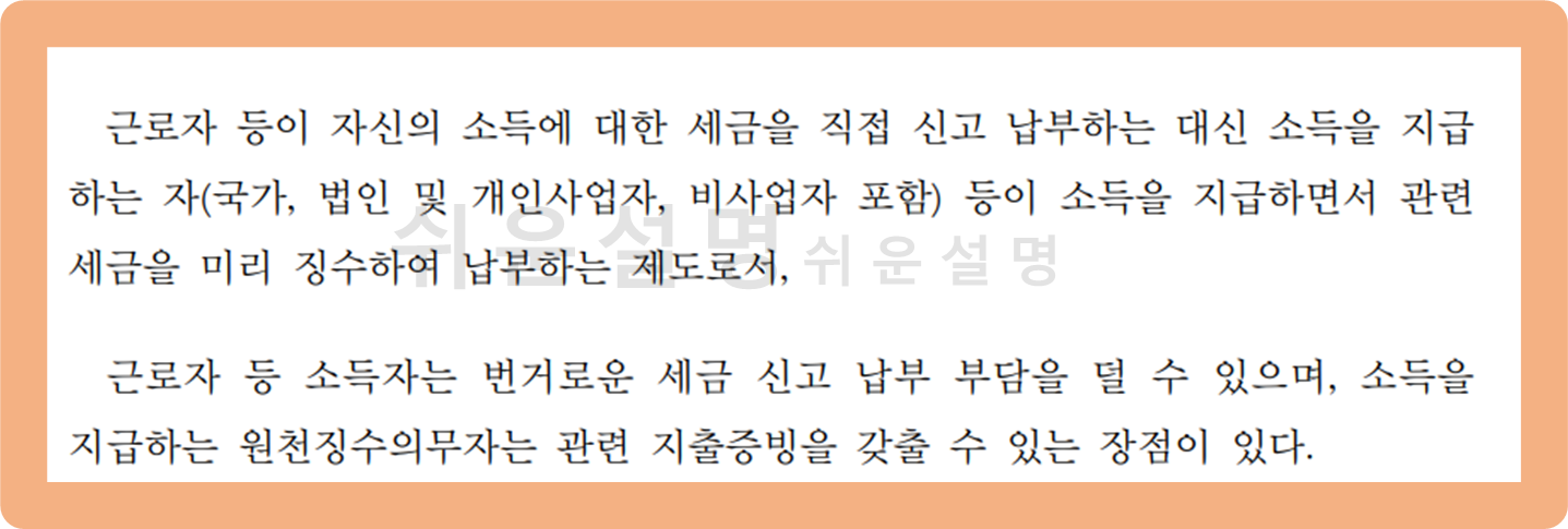 원천세(원천징수)란, 근로자가 자신의 세금을 직접 납부하지 않고 소득을 지급하는 자(ex.사장님)가 소득을 지급할 때 세금을 미리 징수하여 납부하는 제도를 말해요.
