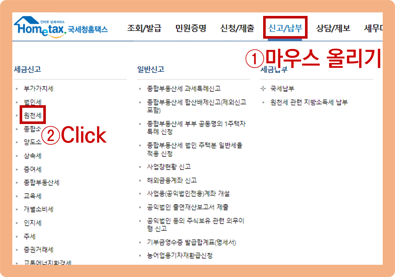 그리고 상단에 있는 '신고/납부' 메뉴에 마우스로 올리면 나타나는 하위 메뉴 중에서 '원천세' 버튼을 클릭해주세요.