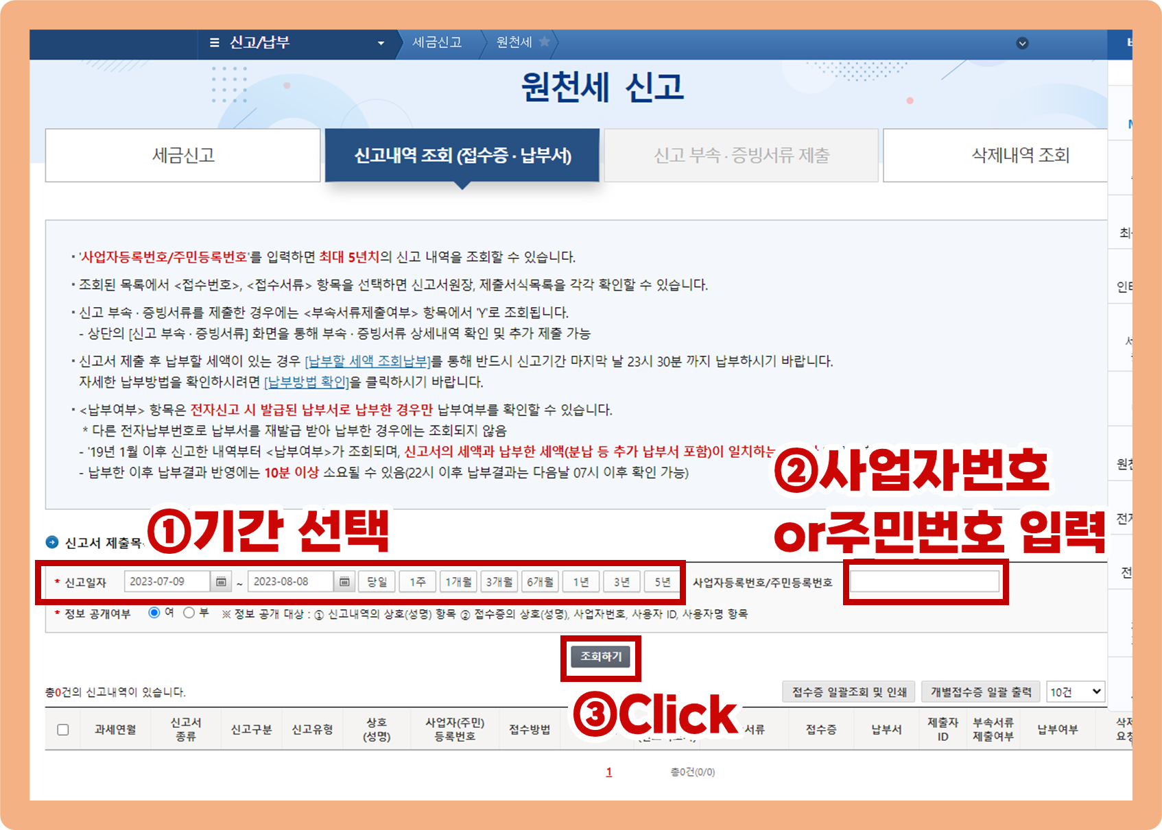조회를 원하는 기간 선택 후 사업자등록번호 또는 주민등록번호 입력해주시구요.
