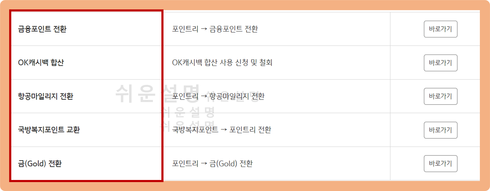KB국민카드 홈페이지 > 개인 > 혜택 > 포인트리 안내 > 11. 전환 서비스 순으로 접속하시면 위 메뉴가 나오는데, 여기서 원하는 전환 서비스를 선택하시면 돼요.