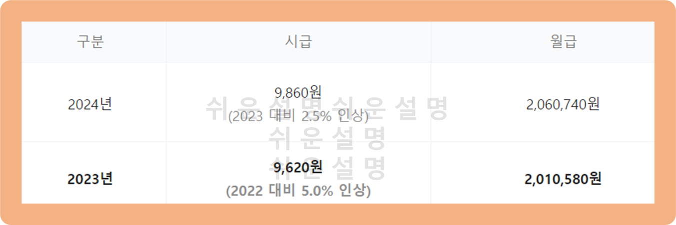 그리고 2024년에는 9,860원으로 결정되었으며, 월급으로 환산 시 206만원이 되네요.