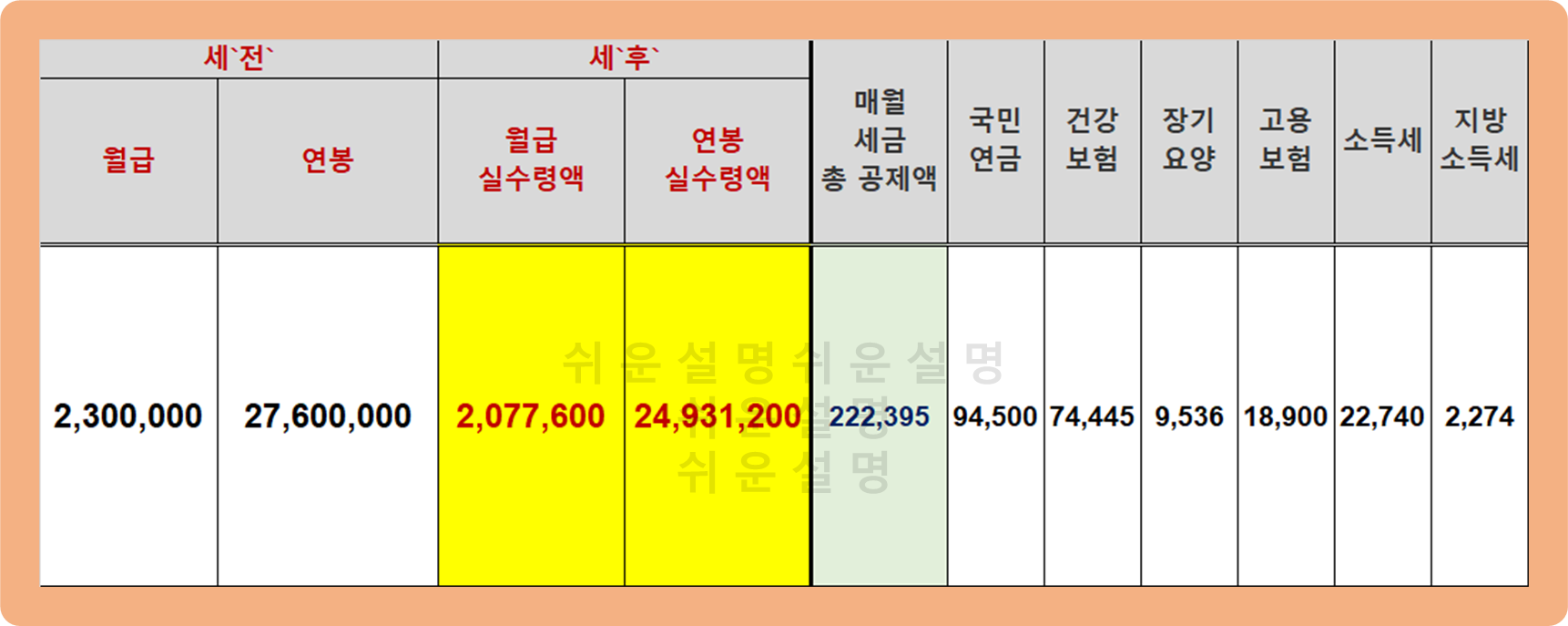 월급 230만원(세전 연봉 2,760만원) 실수령액 대해 알아볼게요.