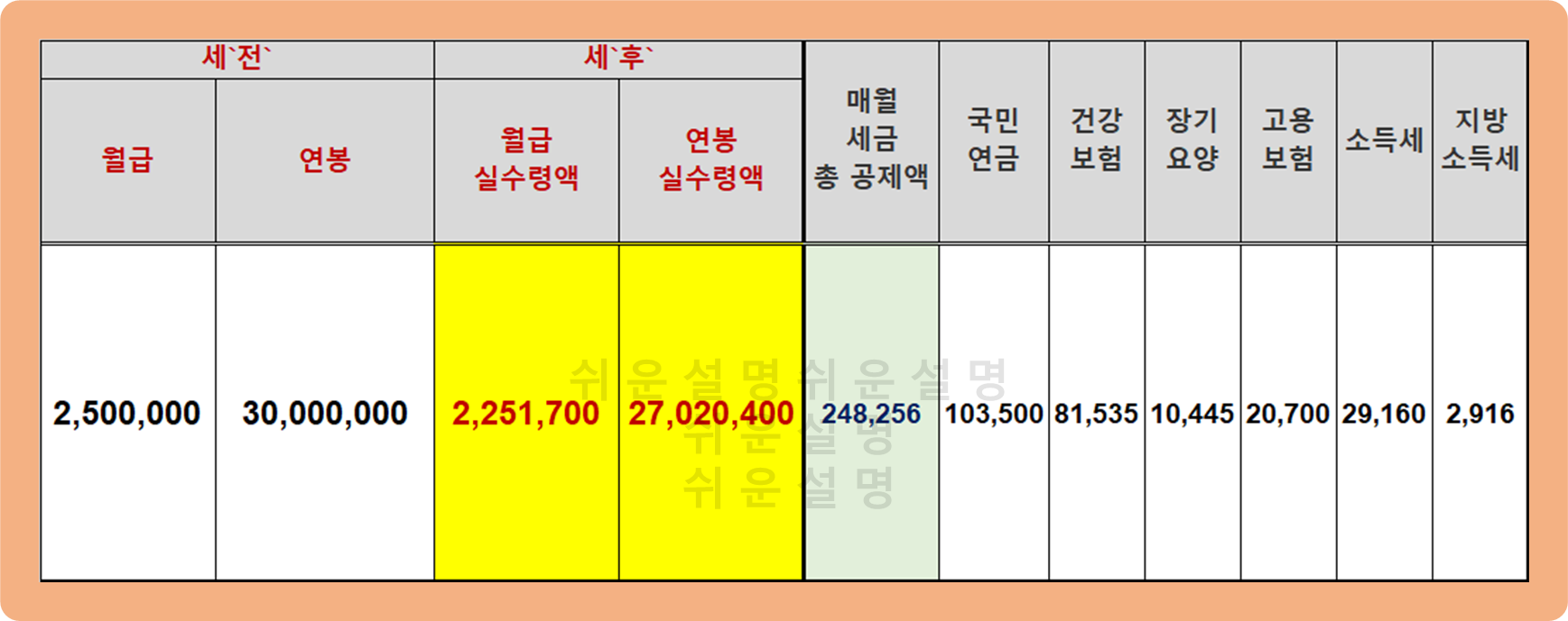 월급 250만원(연봉 3,000만원)실수령액 알아보기.